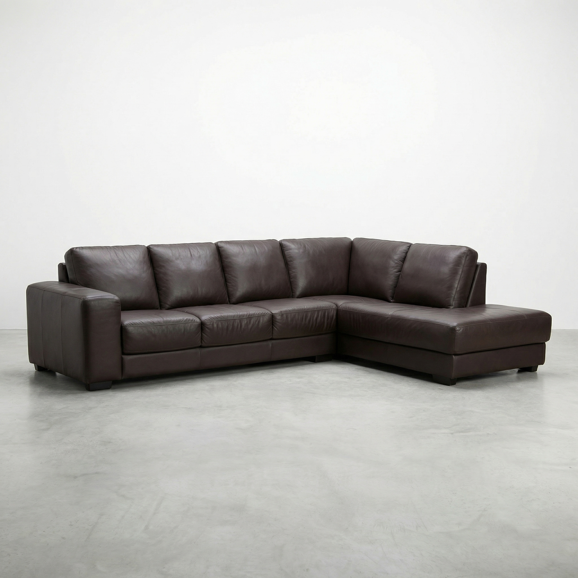 Divan sectionnel en cuir véritable de couleur brun, avec une assise moelleuse et un design classique.