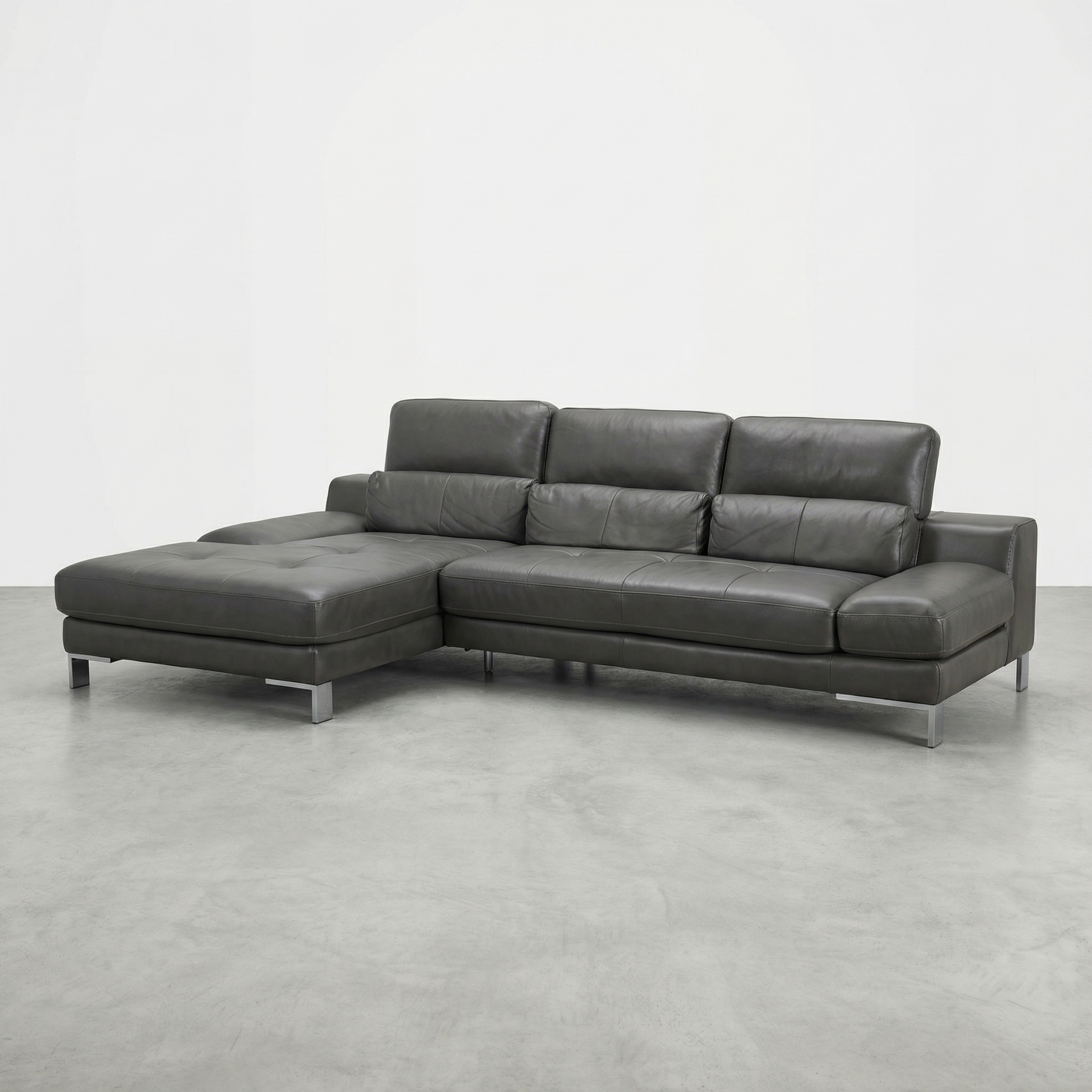 Divan sectionnel en cuir véritable de couleur gris, avec une assise ferme et un design contemporain.